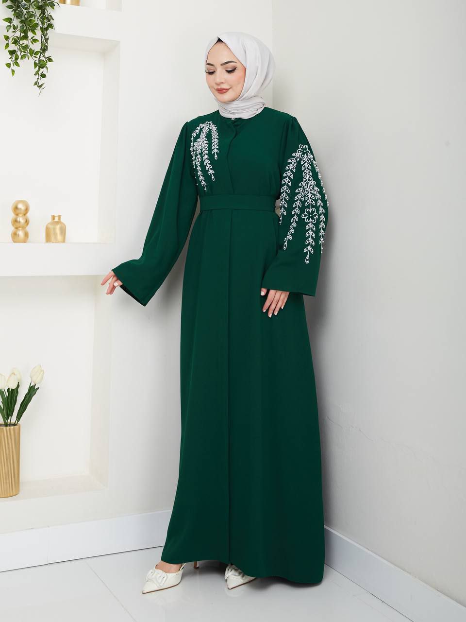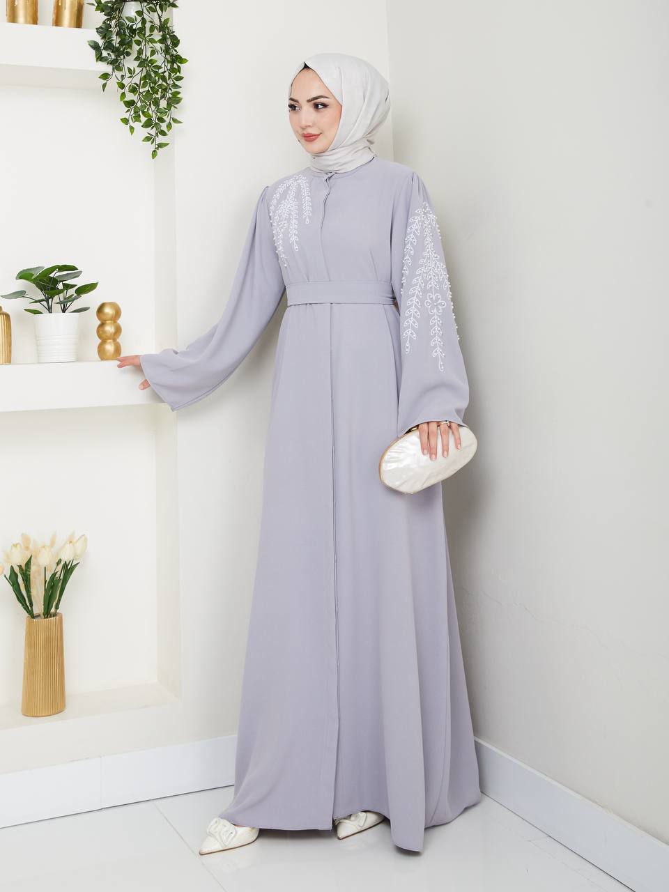 • Features: Elegant long dress with delicate white floral embroidery along the sleeves. Paired with a chic clutch bag.