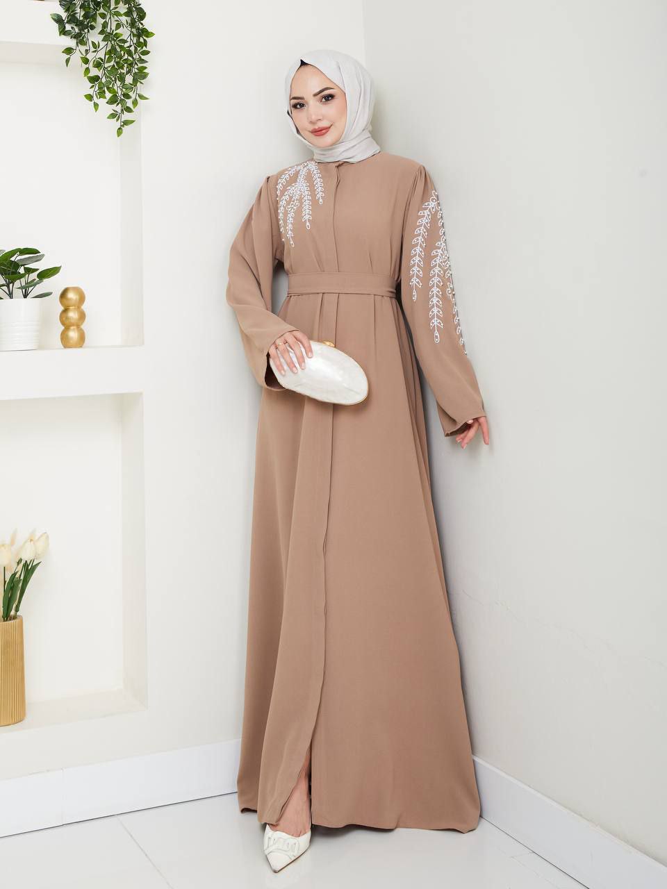 2. Light Brown Floral Dress: Light brown dress with intricate white floral embroidery and a stylish clutch. Ideal for evening gatherings.