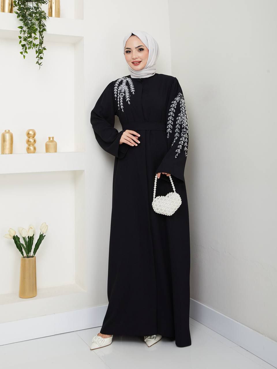 • Features: This chic black dress comes with elegant white floral embroidery on the sleeves. It includes a unique pearl handbag for an added touch of luxury.