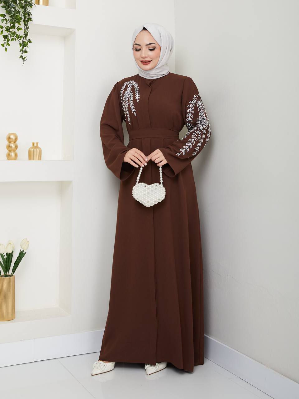 • Features: A classy dark brown dress with intricate floral embroidery along the sleeves. Finished with a stylish pearl clutch.