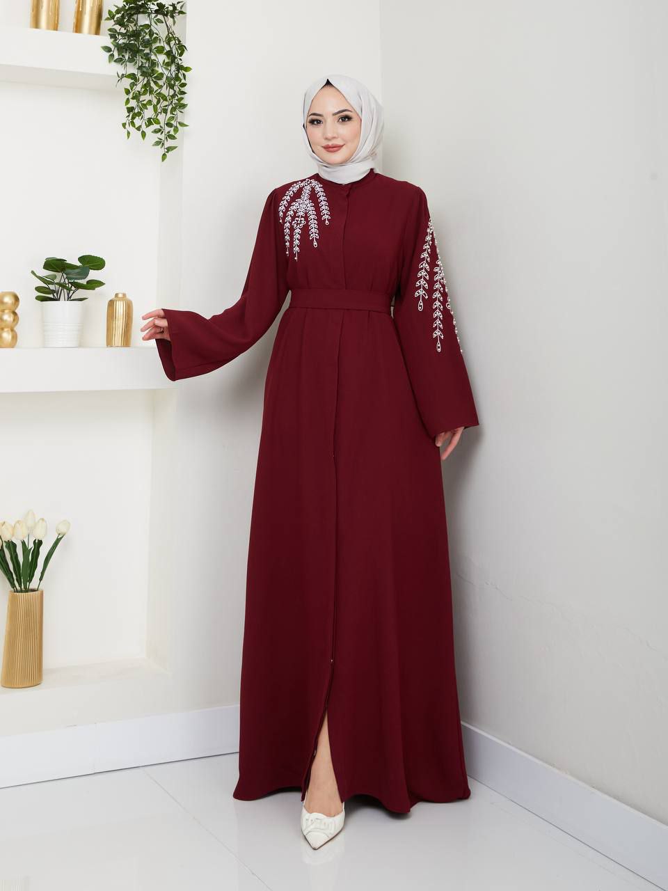 4. Burgundy Floral Dress: Deep burgundy dress featuring white floral embroidery and a flattering belt. Perfect for weddings and classy dinners.