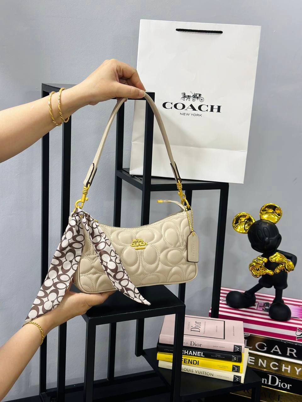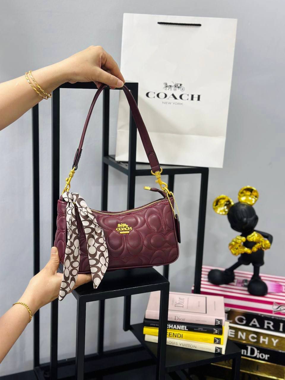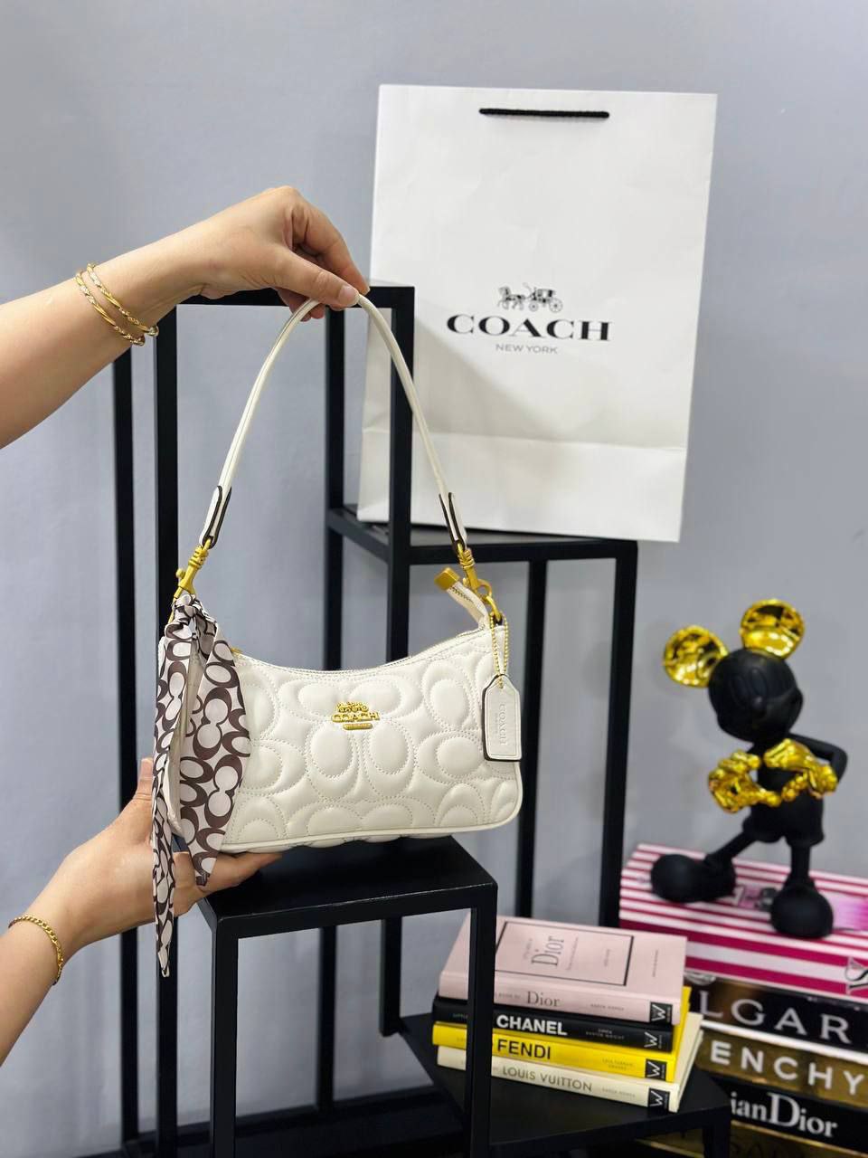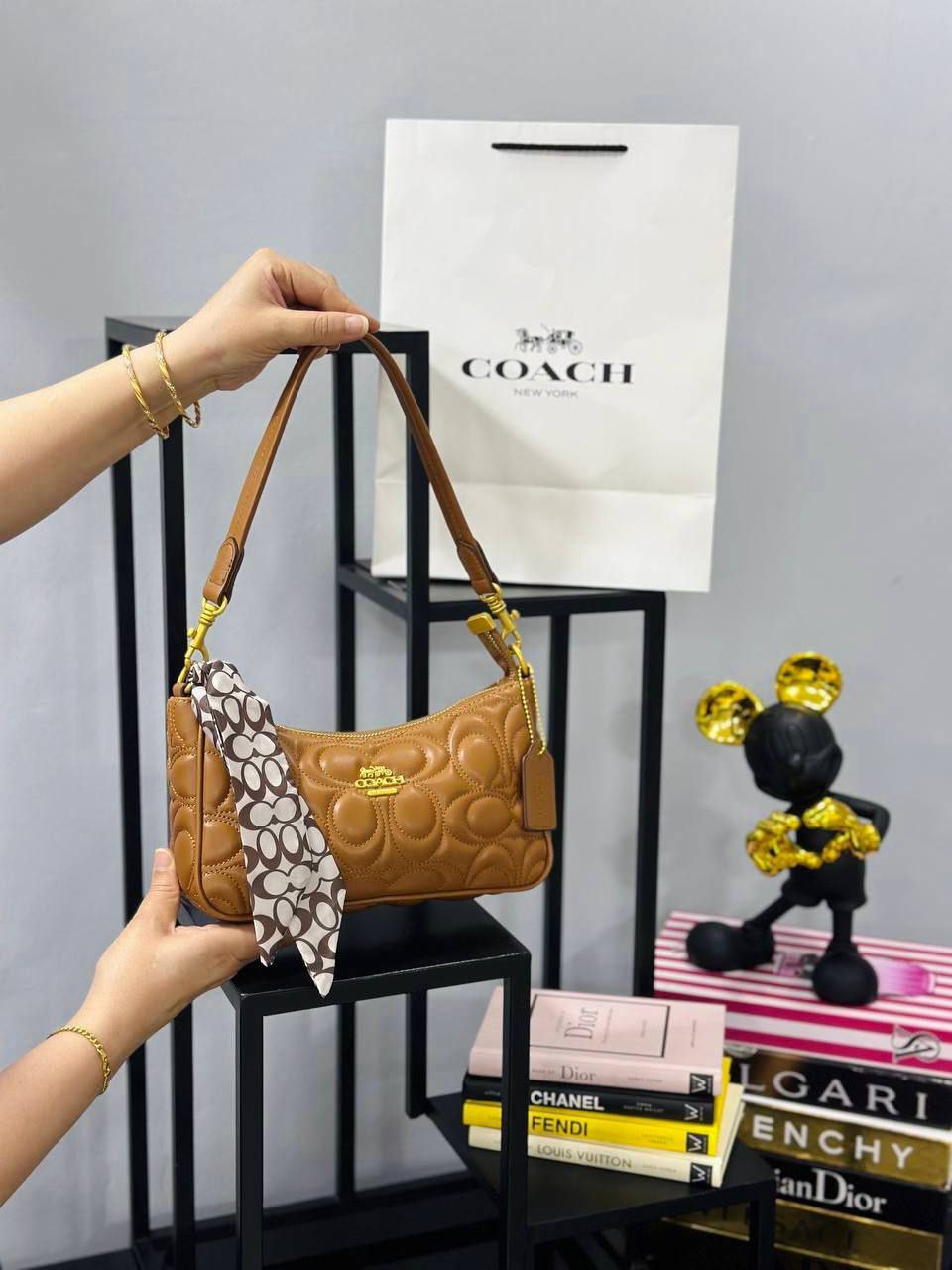 The Coach Handbag is a perfect blend of sophistication and functionality, designed for the modern woman. Crafted from high-quality leather, this tan handbag features the iconic Coach pattern with a luxurious finish. Its structured yet soft design ensures it fits comfortably with any outfit, whether casual or dressy. The gold-tone hardware adds a touch of elegance, while the signature logo and chic scarf detail elevate its style. With dimensions of 25cm x 13cm, this compact yet spacious bag offers ample room for your essentials. Whether for work or a night out, the Coach Handbag is an ideal choice for those seeking both style and practicality.