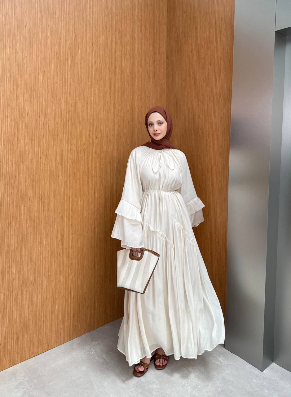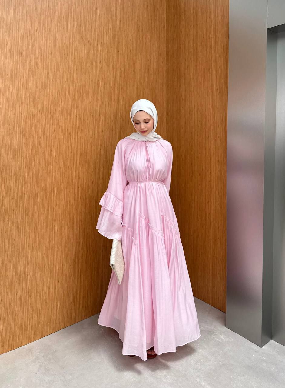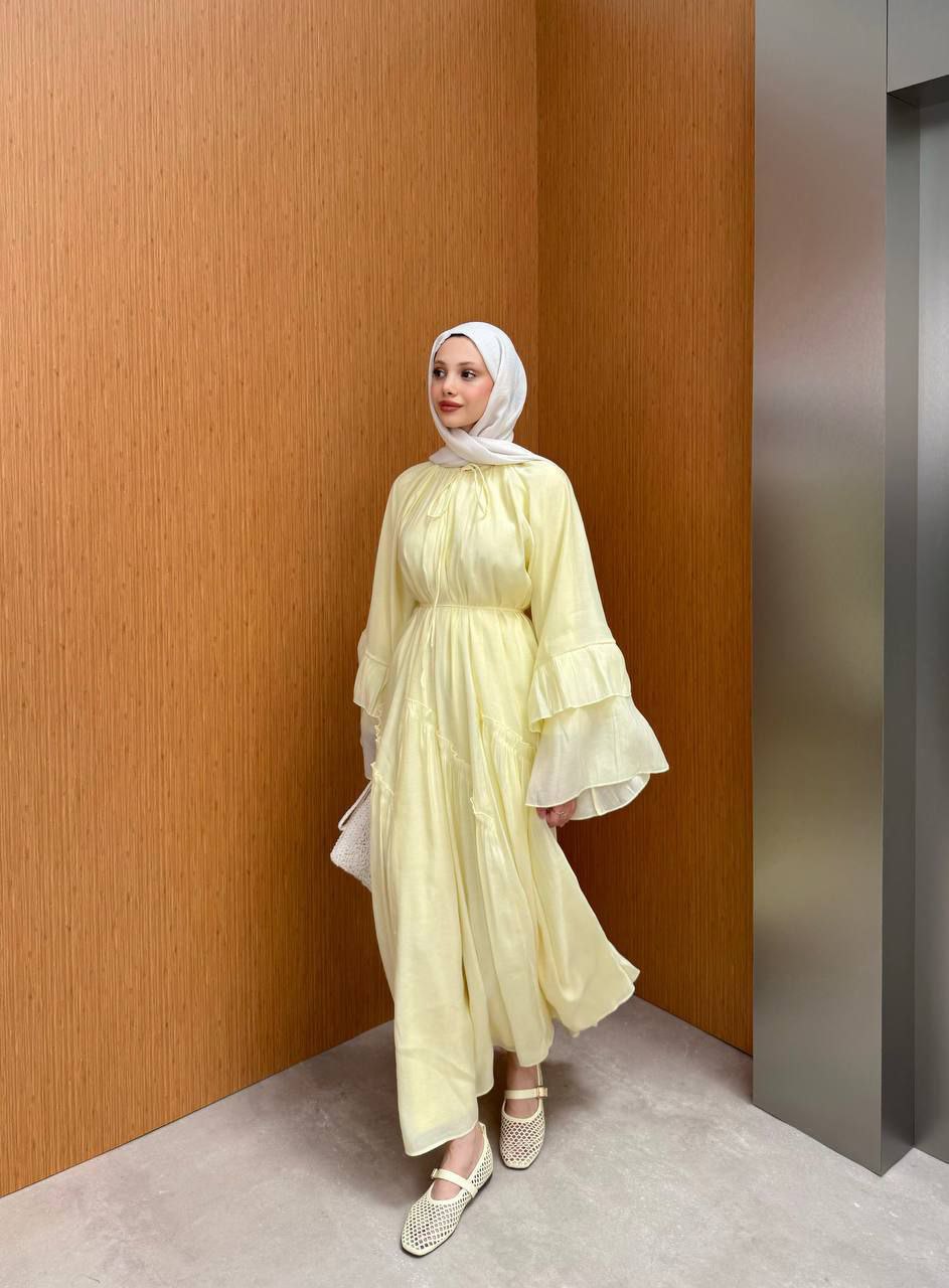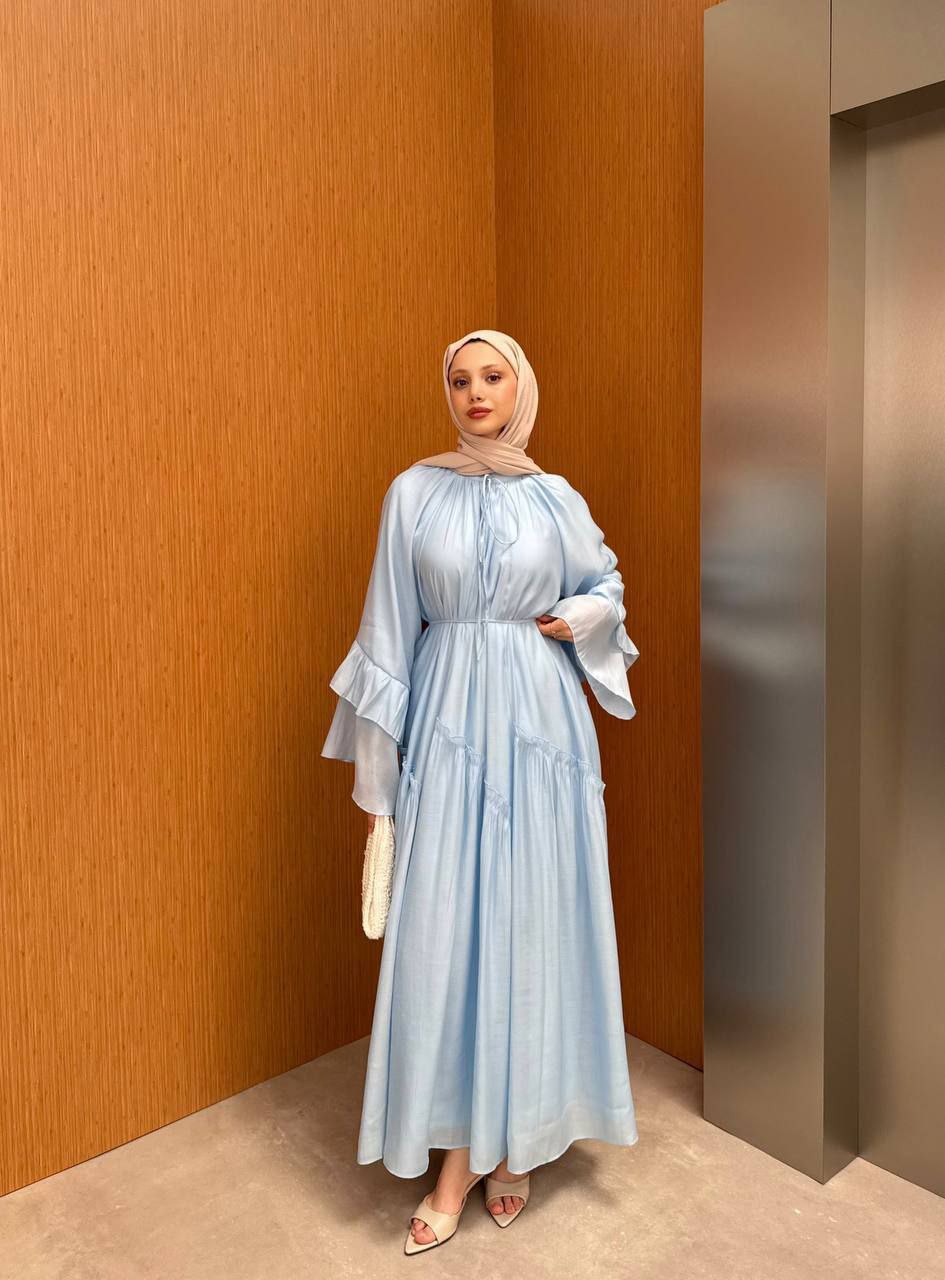 This flowy maxi dress offers a stylish yet modest look. It features ruffled long sleeves and a ruffled hemline, providing a soft, feminine touch. The fabric appears light and breathable, perfect for warmer seasons. The dress has a relaxed fit, designed to offer comfort while maintaining an elegant, flattering silhouette. Whether you’re attending a casual outing or a special event, this dress, with its soft pastel colors, is ideal for an effortlessly chic and graceful appearance. Pair it with sandals or heels for a versatile, stylish look.